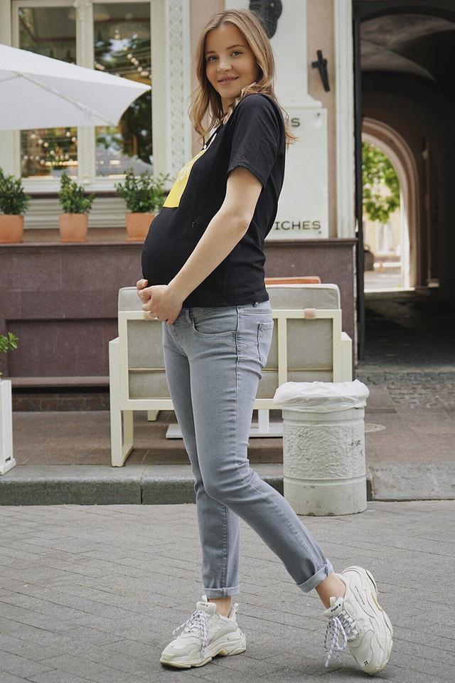 Чудово доповнять повсякденний образ молодої мами стильні джинси прямого силуету. Джинси завужені до низу, з поясом з основної тканини та трикотажним поясом під животик, які забезпечить комфортне носіння штанів на весь період вагітності. Особливість моделі: передні та задні кишені функціональні.