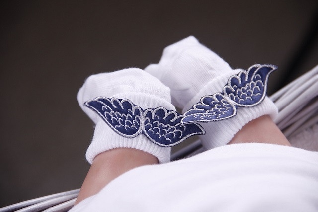 Боді з коротким рукавом прикрашений індивідуальною вишивкою імені дитини, ниткою синього кольору, вишивка виконана в дизайні (корона загострена з вензелями). У комплекті носочки з декоративними крильцями. Боді на кнопочках виконаний зі 100% бавовняного трикотажу інтерлок.
