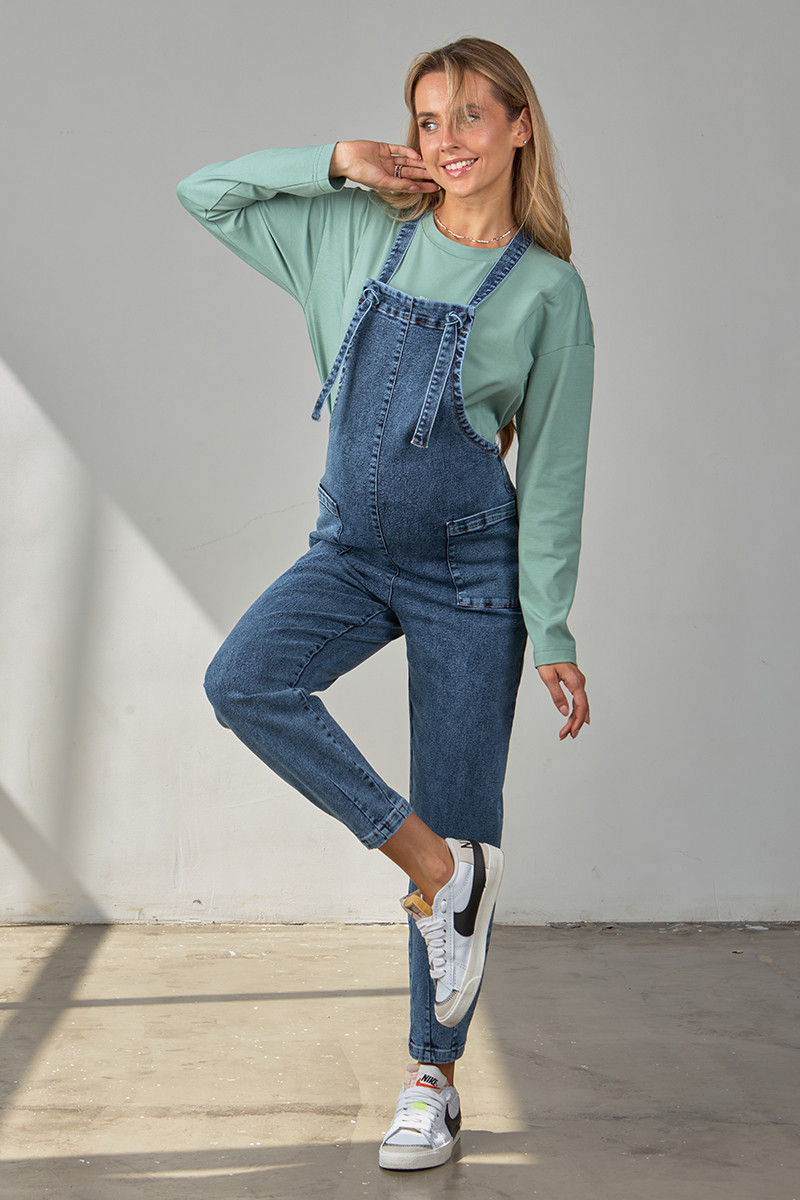 Джинсовий комбінезон для вагітних на бретелях з вузликами.